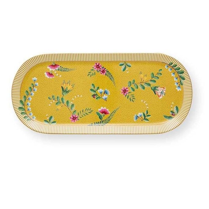 Complete your collection with the La Majorelle cake platter. The yellow cake platter is decorated with the cheerful La Majorelle design. This design features an exotic palm tree surrounded by two herons. The edge of the cake platter is adorned with yellow and white stripes that give the design an elegant flair. Our La Majorelle porcelain will make your china cabinet and table shine!
