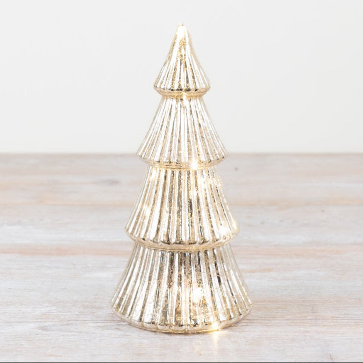 A beautiful glass tree decoration with layered branches and an antique effect glass finish. Complete with lights inside to create a beautiful and atmospheric decoration for the home this season.