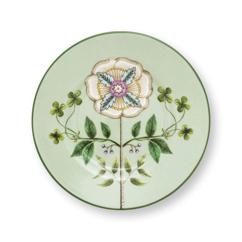 This small light green pastry plate is part of our Lily & Lotus collection. The plate is decorated with a large dandelion in pastel shades. The flower and graceful ferns are symmetrically placed, giving the plate a modern twist. The Petit Four plate features a green rim. Lily & Lotus is the first tableware in Pip Studio's collection that is dishwasher, microwave, and oven safe.