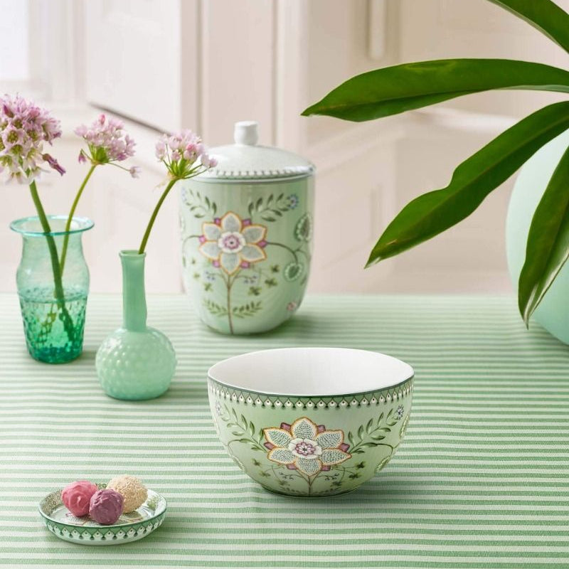 This large bowl is part of our Lily & Lotus collection. The light green bowl is decorated with an imaginative lily in pastel shades. The flower and graceful ferns are symmetrically placed, giving the bowl a modern twist. Lily & Lotus is the first tableware in Pip Studio's collection that is dishwasher, microwave, and oven safe.