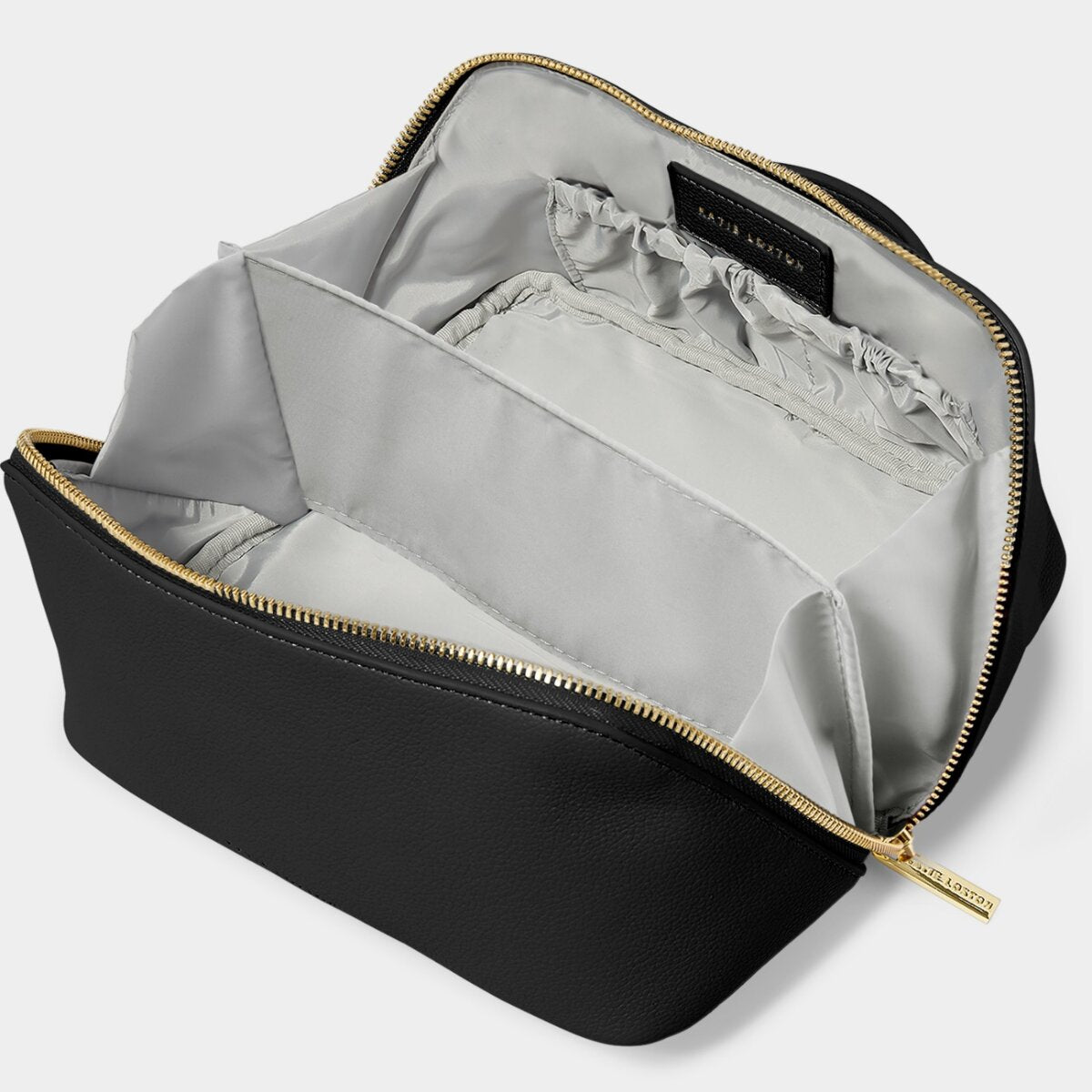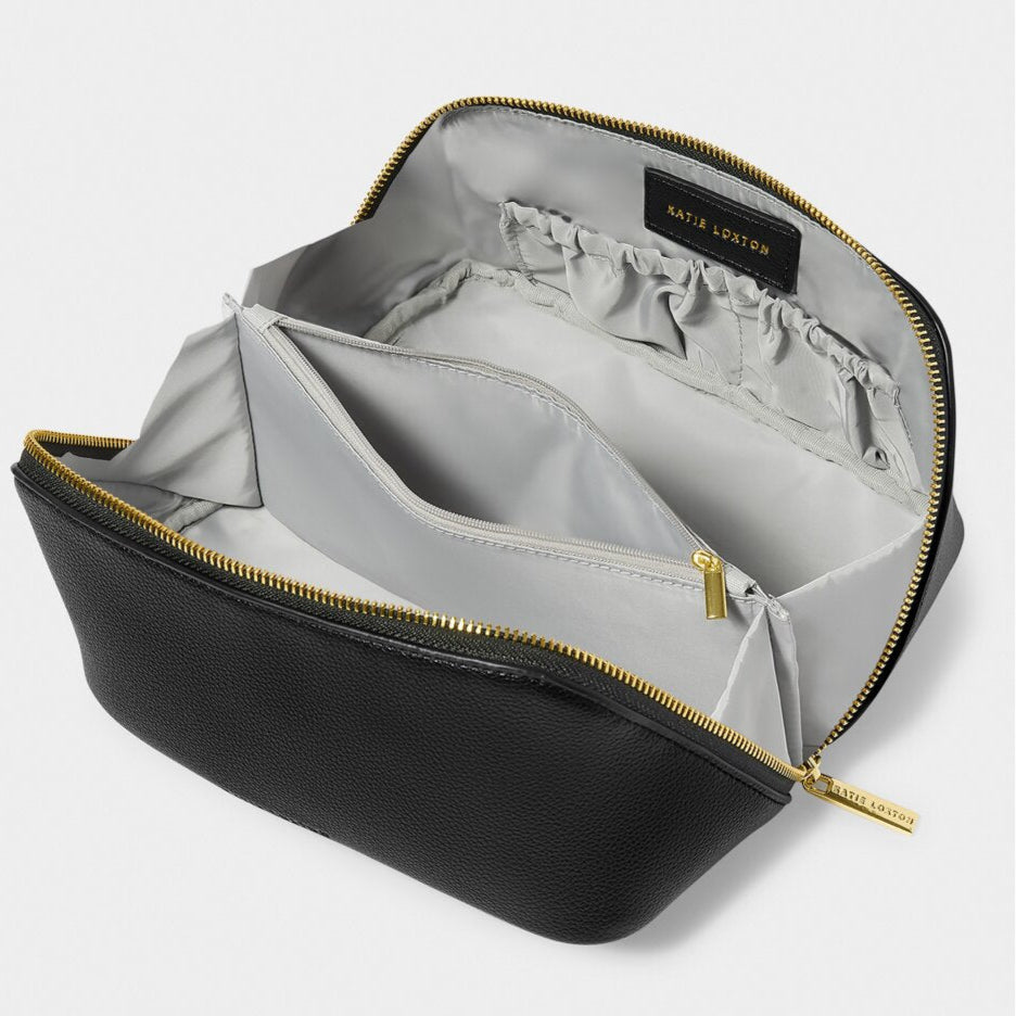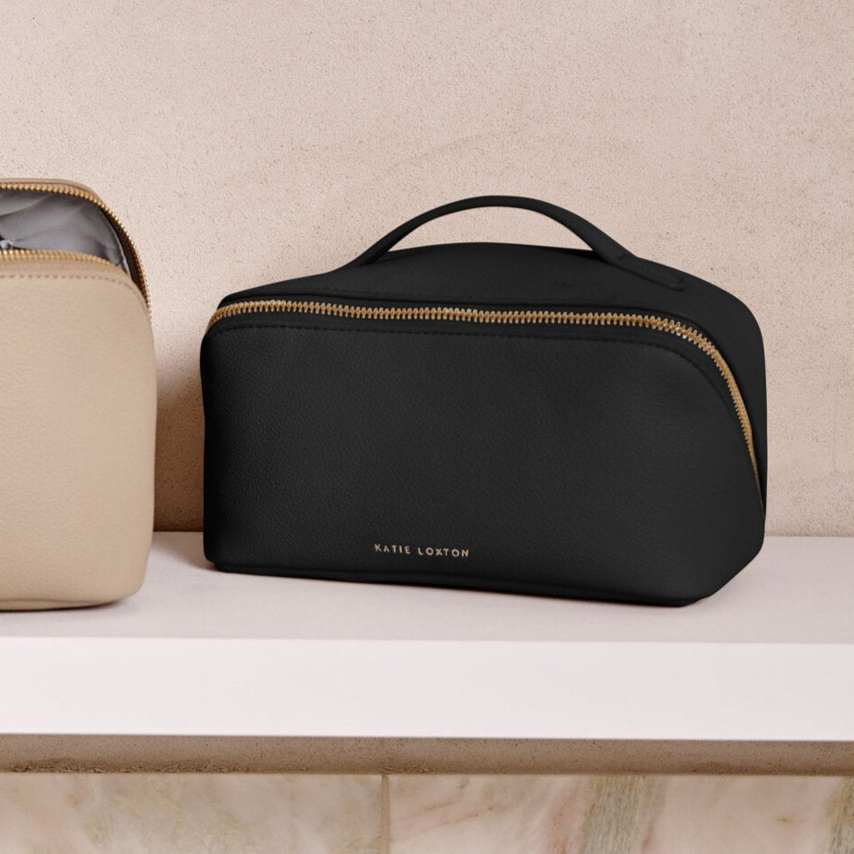 Effortlessly elevate your morning ritual with our Medium Makeup / Wash Bag in Black, a versatile gem that will expand your in-store beauty selection. Boasting a top handle for convenient portability, a zip-around closure for security, and three slip pockets for optimal organisation, this bag is every beauty enthusiast's dream. Crafted from soft vegan leather and featuring a wipeable lining, it is able to remain looking good as new for years to come. Plus, its innovative design allows it to fully open and lay flat on any surface, providing easy access to cosmetics.