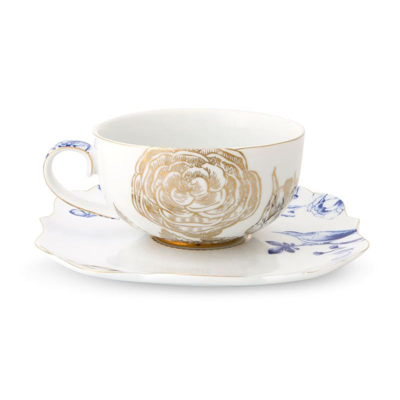 This cup & saucer is part of the Royal White porcelain set. Royal White is refined porcelain with subtle blue painted features and golden elements.